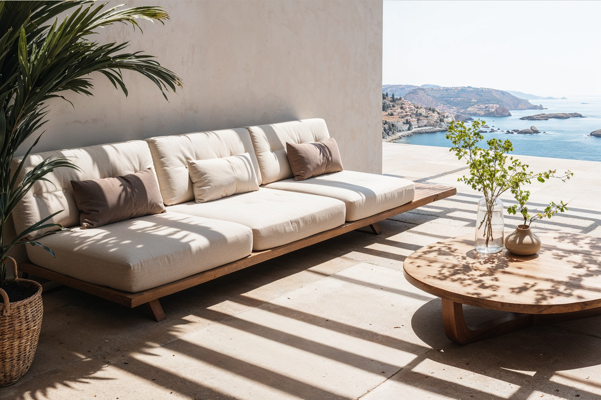 Mediterranean dreams meet minimalist elegance. Soft textures embrace golden hour light, creating an intimate sanctuary overlooking endless blue horizons. Pure tranquility captured in natural materials