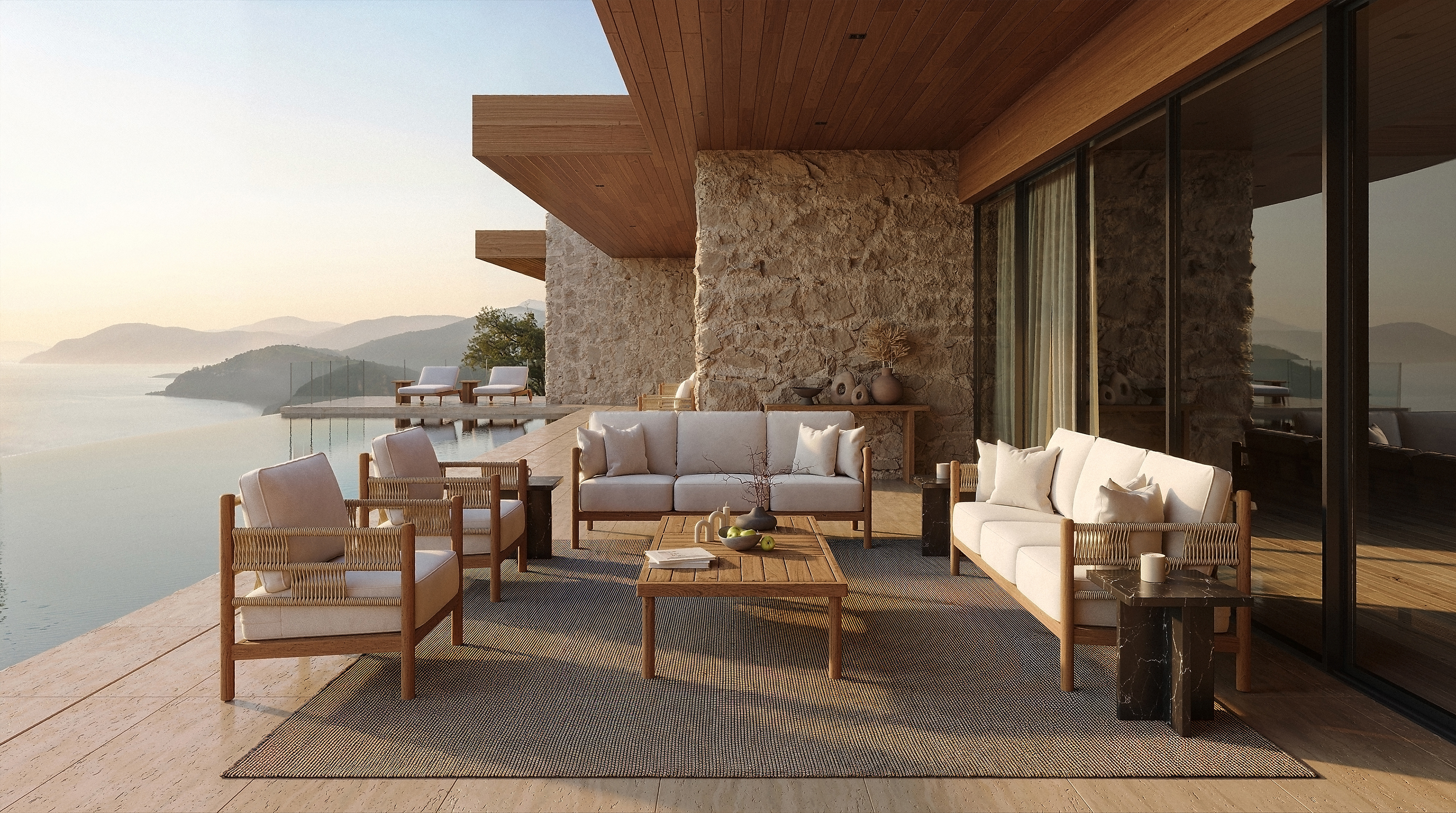 This visual series highlights the refined craftsmanship of high-end outdoor furniture, blending natural textures with modern comfort. Woven rope detailing, warm wood tones, and plush cushions invite relaxation while showcasing durability and design precision. Each piece is curated to complement open-air living without overshadowing the landscape—where furniture becomes the quiet hero of the space.