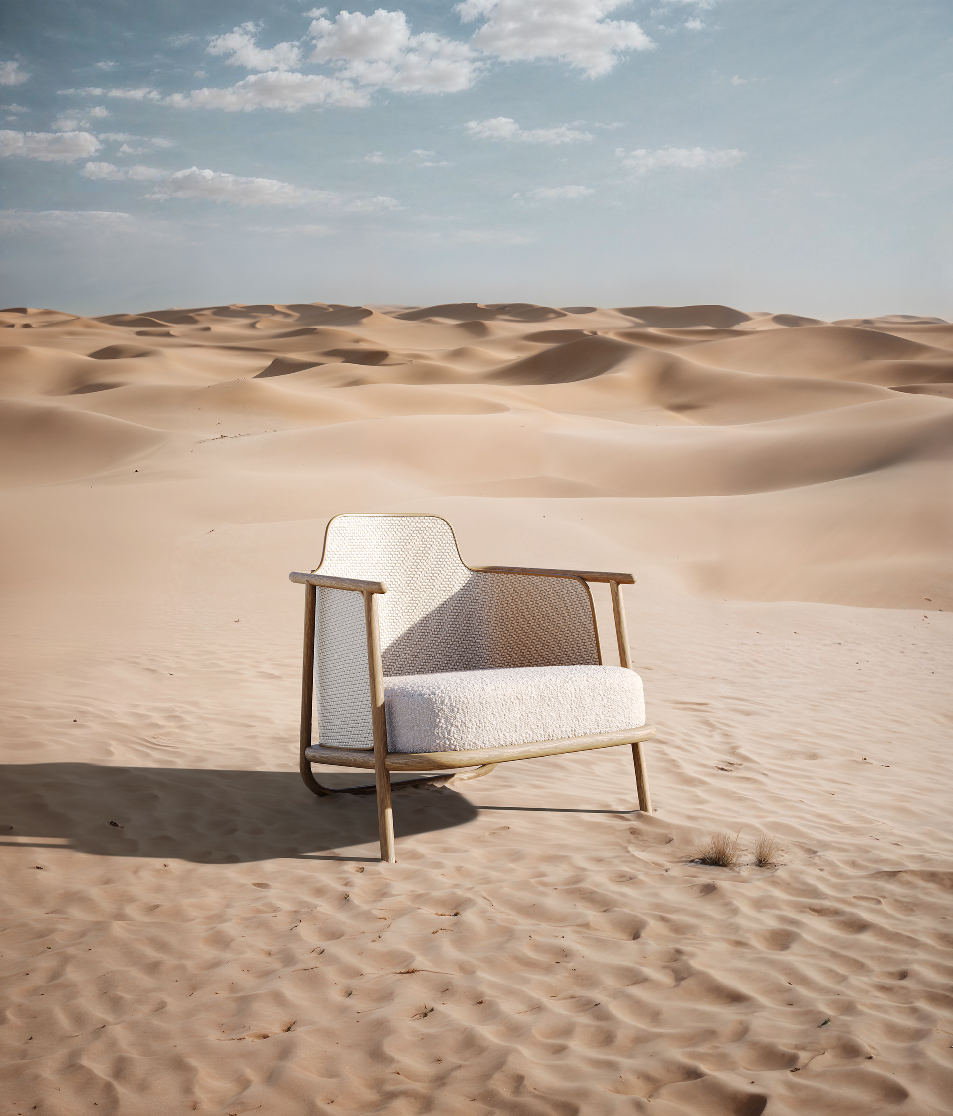 An exploration of contrast — a contemporary armchair set against the vast emptiness of the desert. The soft textures and refined wooden frame stand in dialogue with the raw, endless dunes, creating a striking visual narrative where comfort meets isolation. A minimal composition that highlights the elegance of design within nature’s extremes