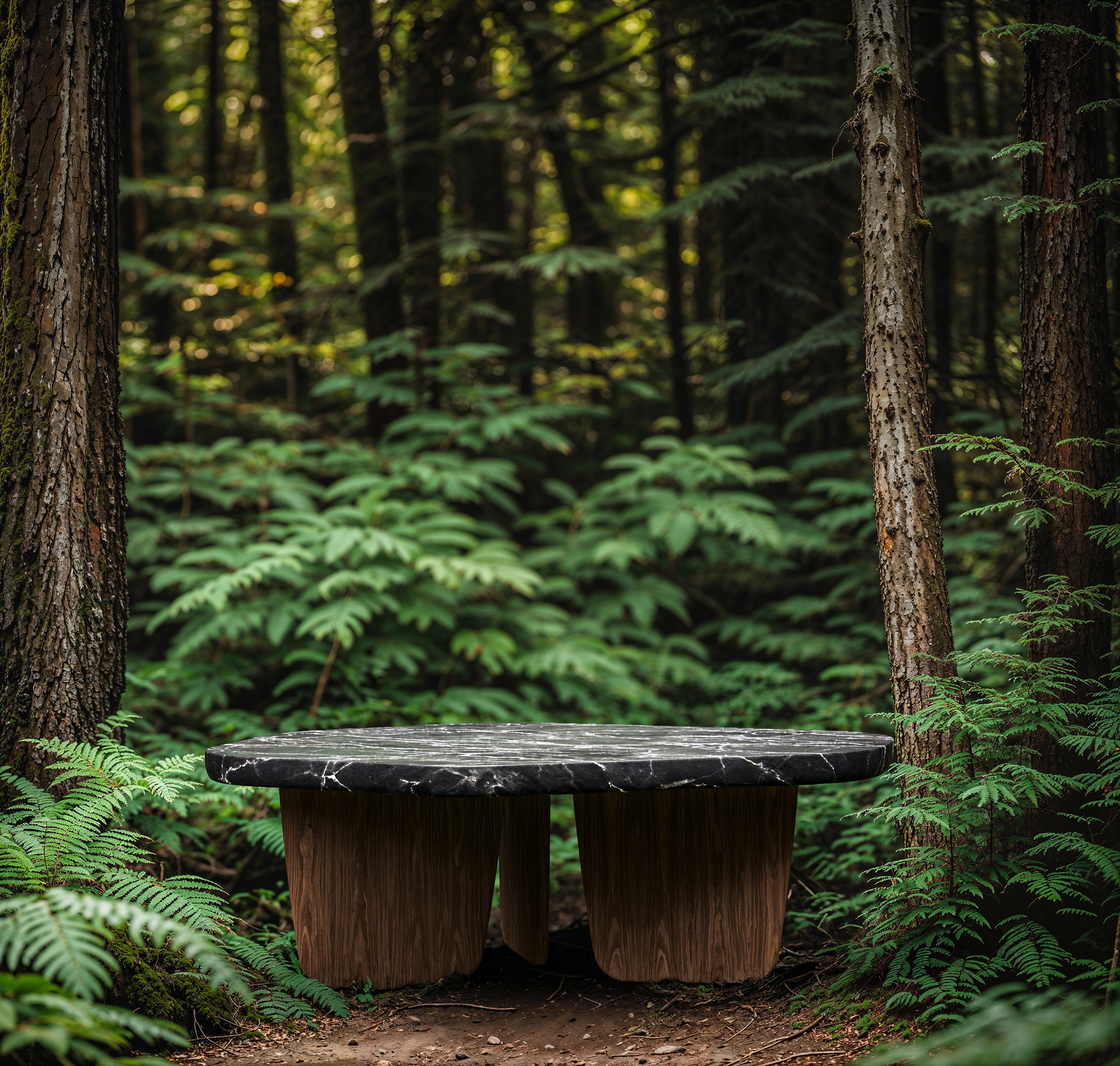 A fusion of nature and design — this piece embodies harmony between organic surroundings and modern craftsmanship. The solid marble top, resting on sculpted wooden bases, feels both grounded and refined, seamlessly blending into the forest atmosphere. A minimal yet powerful statement where furniture meets landscape