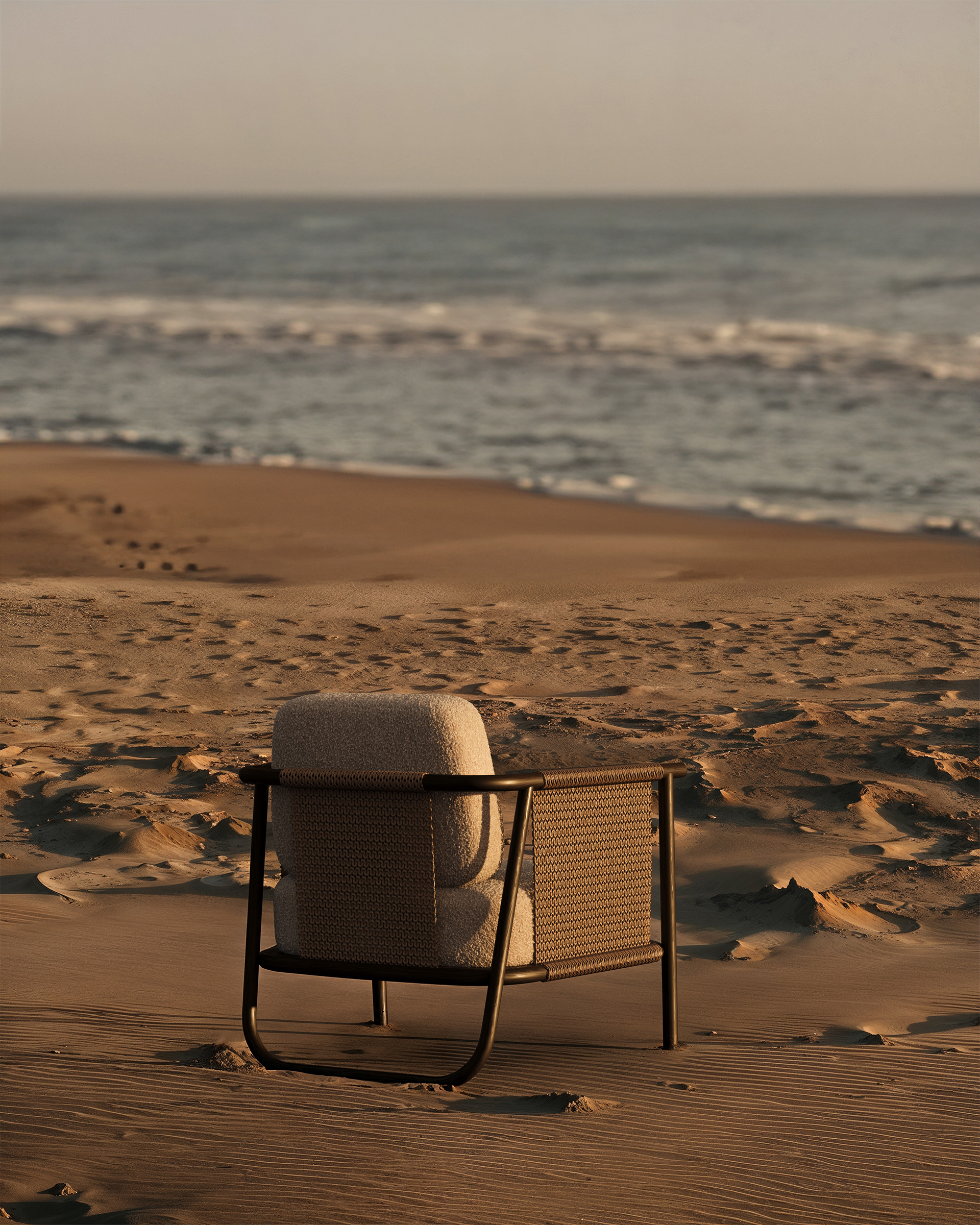 A serene encounter between modern comfort and the vast horizon. The soft, inviting textures of the armchair contrast with the raw beauty of the shoreline, evoking a sense of calm and contemplation. A visual exploration where crafted design meets the rhythm of the sea